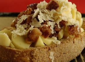 Passe o alho pelo pão e leve ao forno preaquecido para dourar ligeiramente. Retire do forno e disponha sobre o pão o provolone e o bacon. Regue com azeite e leve ao forno só para aquecer ligeiramente. Sirva em seguida.