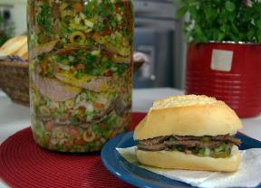 Em uma travessa ou em um pote de vidro, coloque, alternadamente, fatias da carne e o molho. Feche a travessa ou o pote e mantenha na geladeira aproximadamente dois dias antes de começar a consumir, desta maneira o sabor ficará ainda melhor.