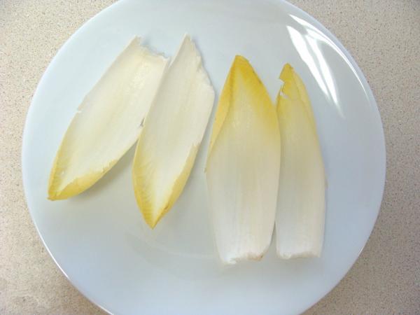 1. O primeiro passo desta receita especial é preparar as endívias: corte um pouco do pé, rejeite as folhas de fora e separe as restantes. Se necessário, lave e seque as folhas.