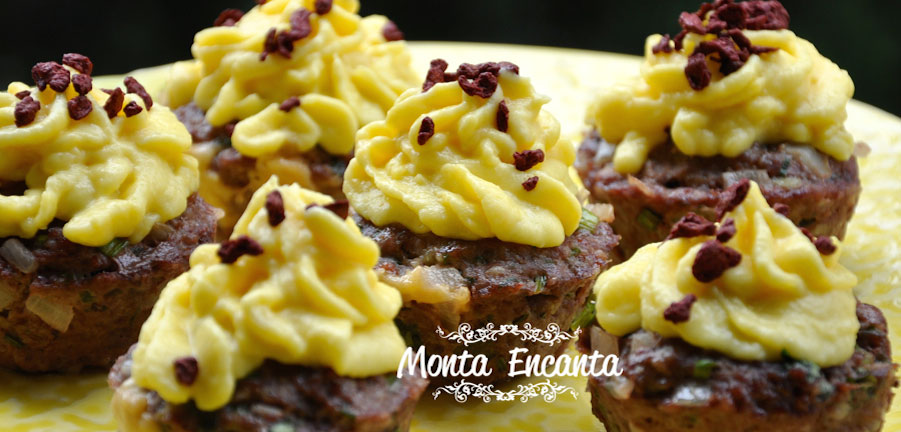 Para hoje a idéia é molda-la na forma de cupcake, transformando a em lindos bolinhos salgados, cupcales assados de carne moída, recheados com ou de ovos de codorna ou com queijo derretido, decorado com purê cremosos de mandioquinha e flocos crocantes de bacon. … nham nham … Uma delicia … de dar água na boca e sem sujeira na cozinha.