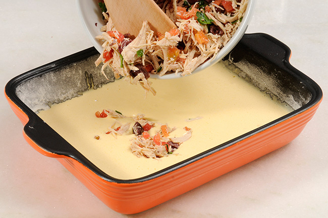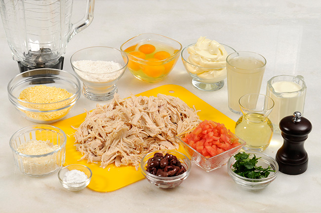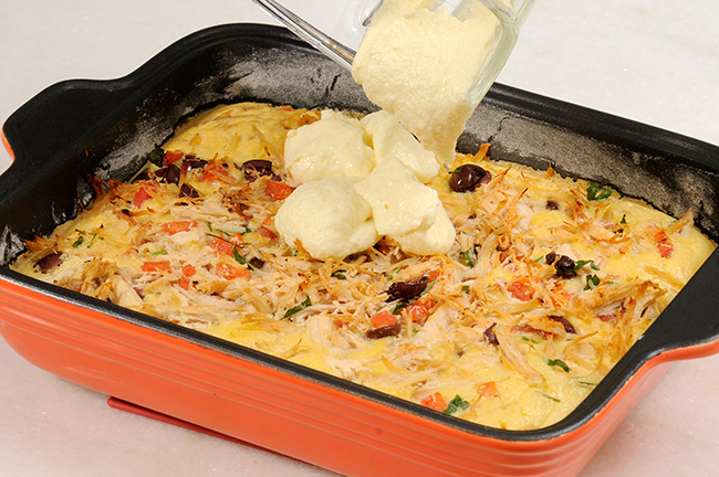 A farinha de milho, parceira perfeita para o frango, deixa a torta dourada e crocante. Como estamos trabalhando com vários ingredientes, veja que é possível substituí-los por outros e variar o sabor. Por exemplo, alcaparra ao invés de azeitonas, ervilhas tem troca da salsinha ou até substituir o frango por carne moída. Se quiser diminuir as calorias da cobertura, basta usar queijos menos gordurosos como o branco ou cottage (tipo de coalhada suave de queijo).