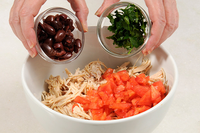 Misture o frango, tomates, azeitonas, cheiro verde, sal e pimenta em um bowl.